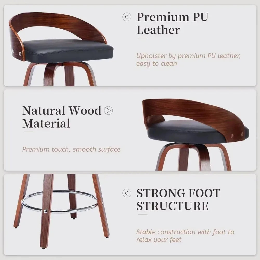 Elevate your dining space with the 25 Inch Swivel Bar Stool Set of 2. This counter-height stool pairs a walnut wood backrest with sleek black PU leather upholstery, delivering a refined mid-century vibe fused with modern industrial charm.