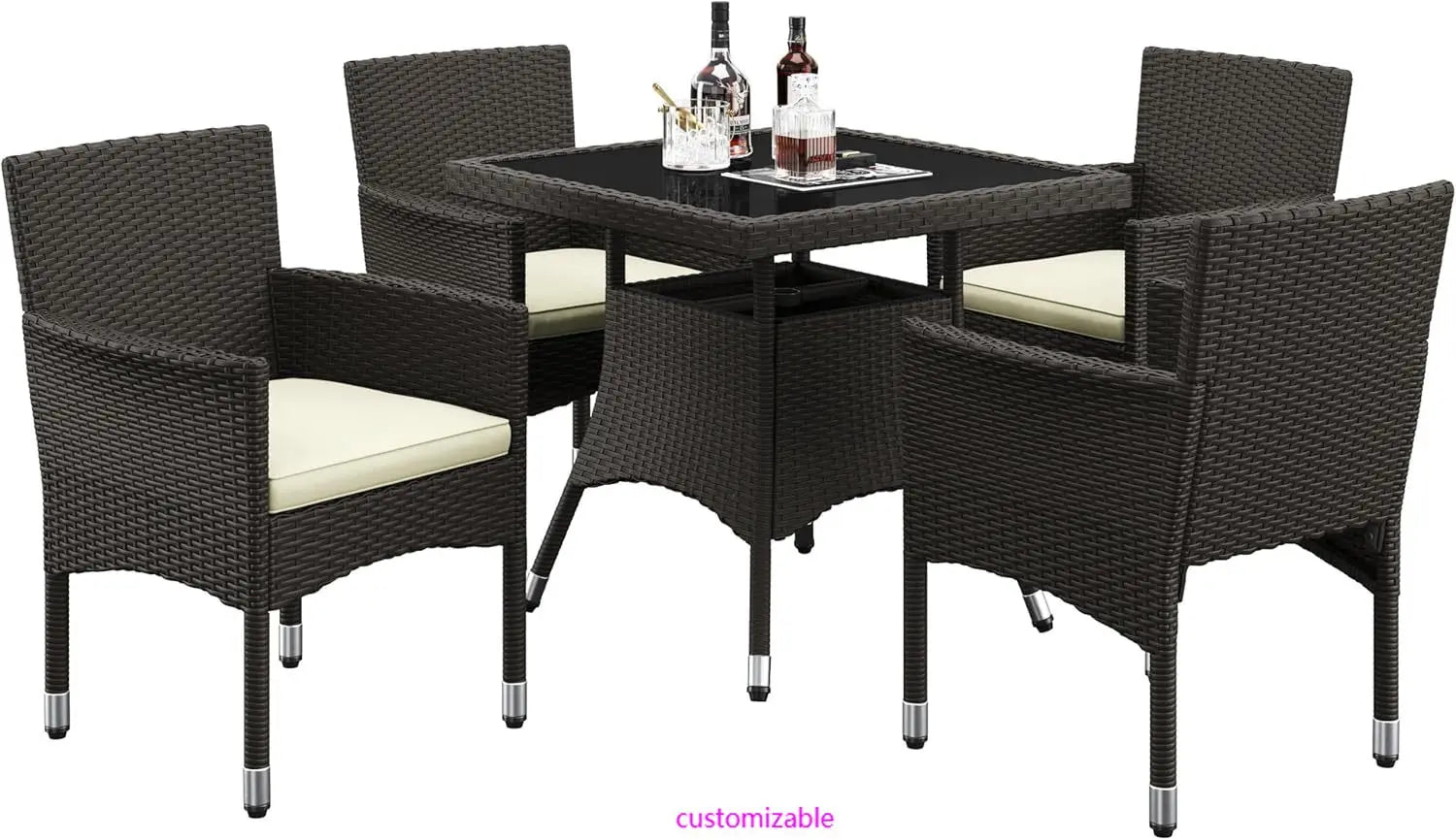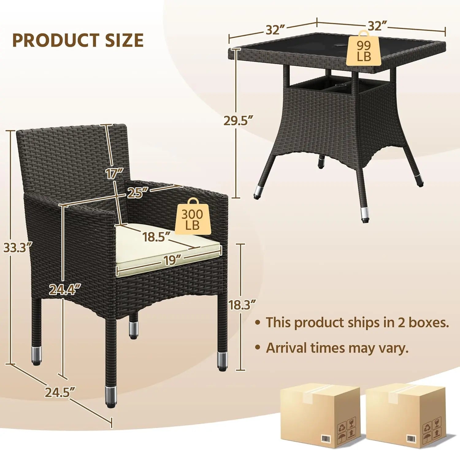 Why choose this outdoor dining set? Its classic Brown/Beige rattan aesthetic pairs with any outdoor style, while the tempered glass tabletop provides a clean, easy-to-clean surface for meals, drinks, and décor. Perfect for al fresco dining and entertaining, it offers both comfort and practicality for patios, gardens, and terraces.
