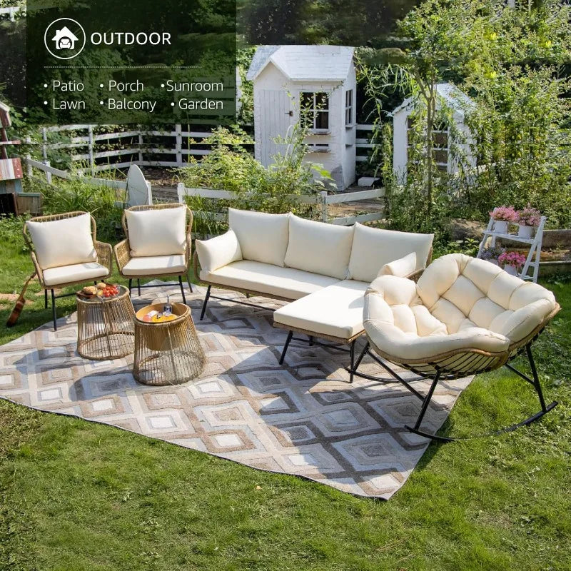 - Complete 7-piece configuration: Includes an L-shaped sectional sofa, an armchair, a royal rocking chair, a round ice bucket table, and a side table—perfect for hosting, lounging, and relaxing with friends.