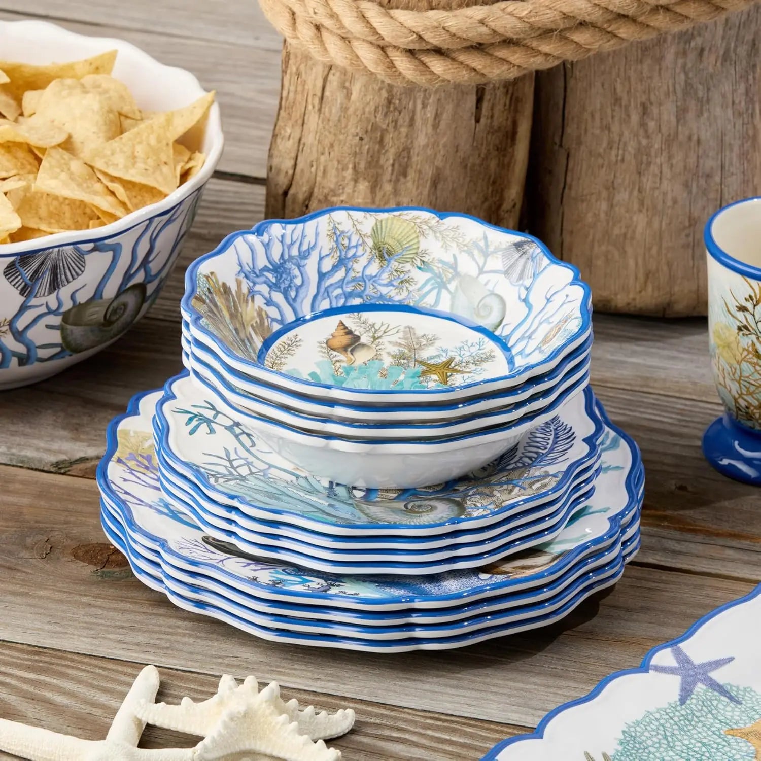 Blue Lagoon Melamine 12-Piece Dinnerware Set — a service for 4 that brings coastal charm to every meal with a coastal coral design and marine-inspired artwork. The set includes 11-inch dinner plates, 9-inch salad plates, and 28-ounce bowls, all enhanced by delicate scalloped edges and vibrant blue accents that evoke a seaside retreat on your table.