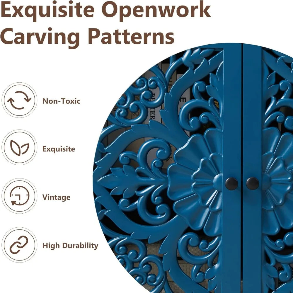 Why choose this cabinet? It offers a rare combination of artisan carved aesthetics and practical flexibility. The durable construction handles daily use, the adjustable shelves maximize organization, and the included anti-tip kit plus soft-close hinges provide safety and convenience. Elevate your living space with this refined blue accent cabinet that pairs traditional charm with modern usability.