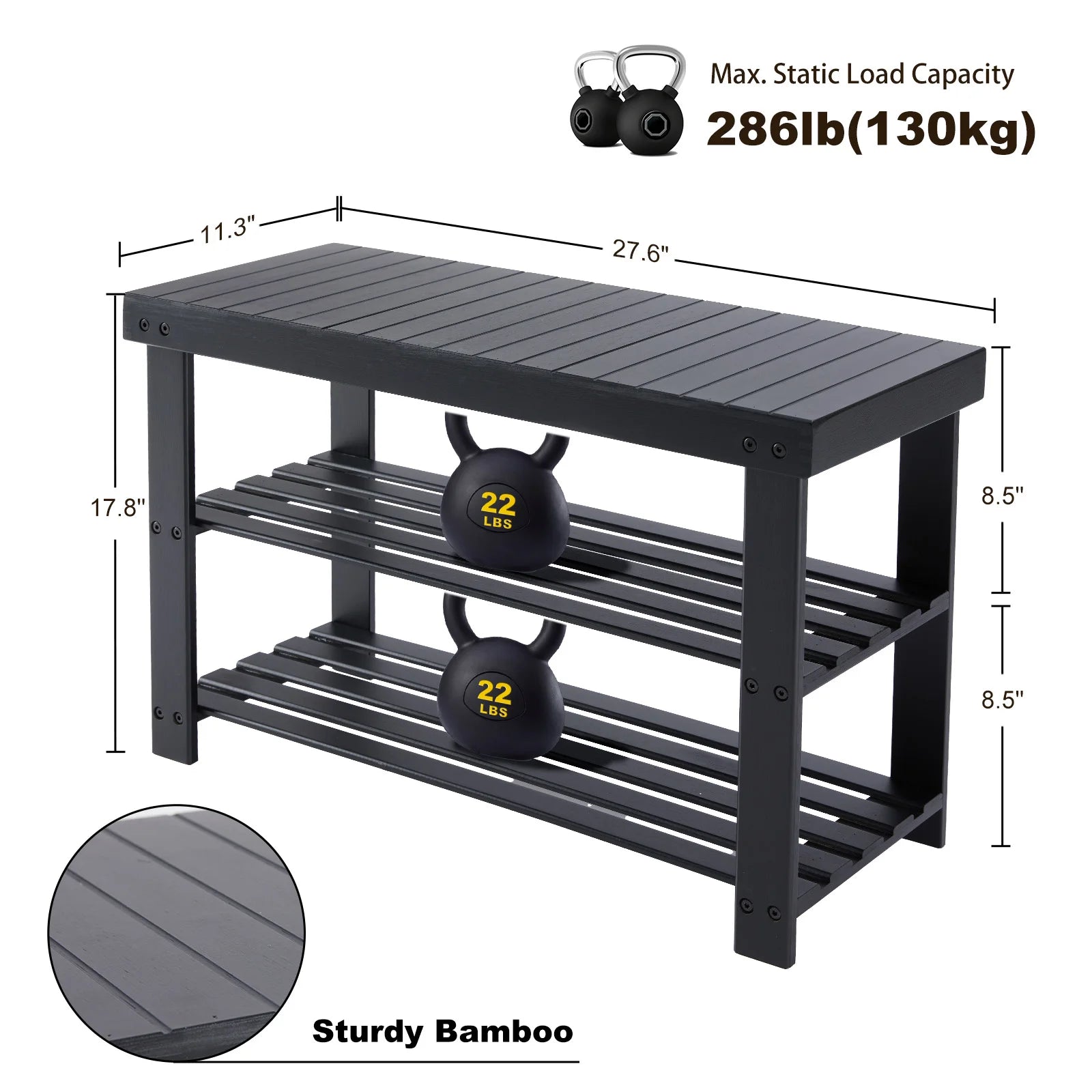 - Sturdy and spacious — top weight capacity 286 lbs; each tier supports 22 lbs; compact footprint of 11.3" D × 27.6" W × 17.8" H.