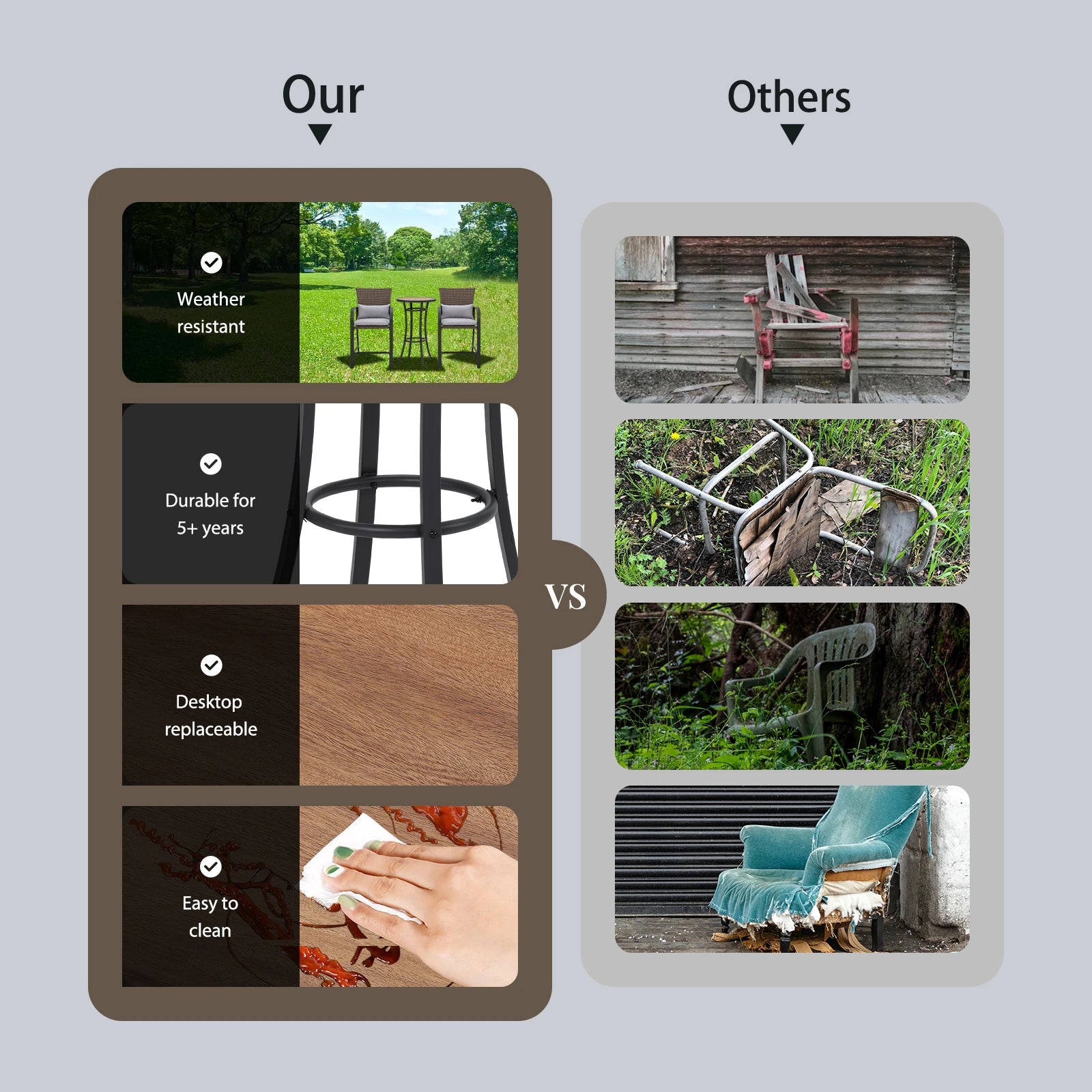 - Three-piece set includes a bar-height table and two stools, ideal for intimate conversations and casual meals al fresco.