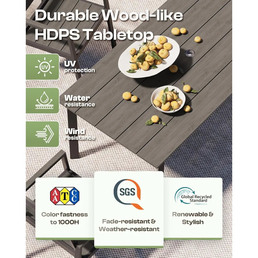 - Premium materials: Lightweight yet strong aluminum frame with weather-ready coatings and HDPS wood-like table top that resists the sun and moisture.